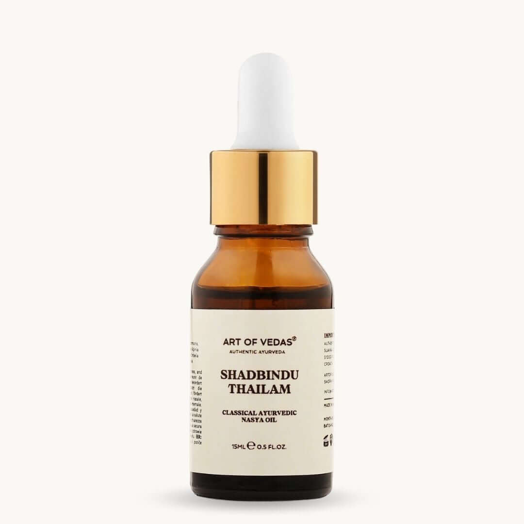 No, Shadbindu Thailam viene applicato nasally (all'interno delle narici), non topicamente sulla pelle o sul cuoio capelluto. L'olio raggiunge il cuoio capelluto e i follicoli piliferi attraverso vie interne—tramite una migliore circolazione nella regione della testa e il nutrimento dei sistemi nervoso/vascolare che alimentano il cuoio capelluto. Non lo stai versando sui capelli; stai supportando la salute dei capelli dall'interno.